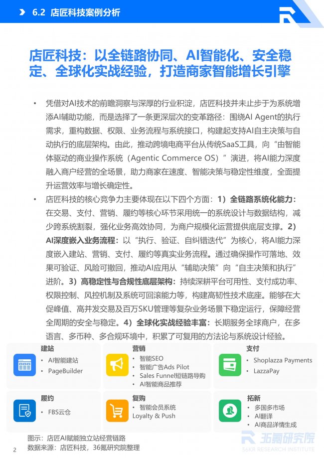 36 氪研究院在報告中指出,未來十年的電商平臺,很可能不再只是 SaaS 工具,而是能夠承載智能體持續(xù)運行的商業(yè)基礎設施。而以店匠科技為代表的 Agentic Commerce 平臺實踐,正為這一趨勢提供重要參考。