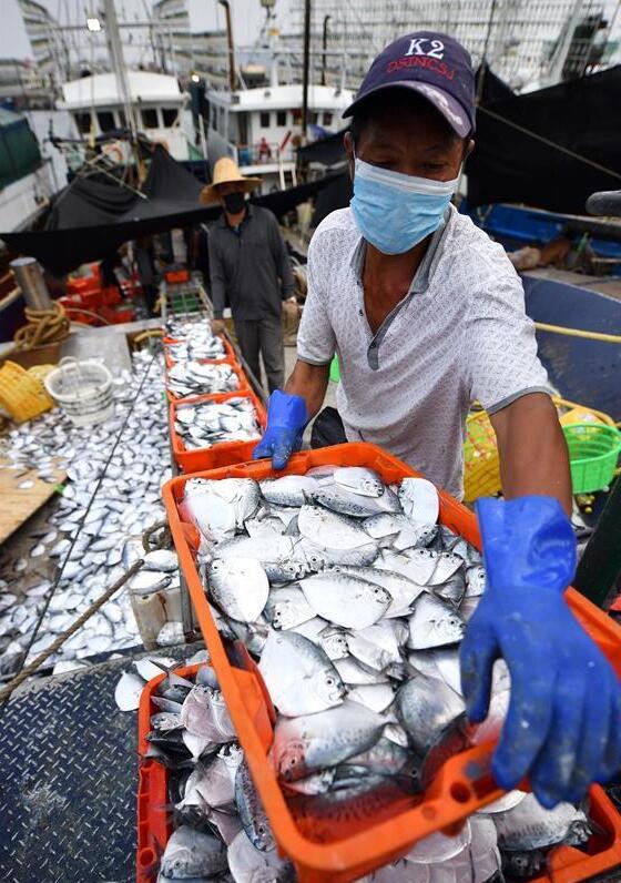 漁民在三亞市崖州中心漁港卸魚貨