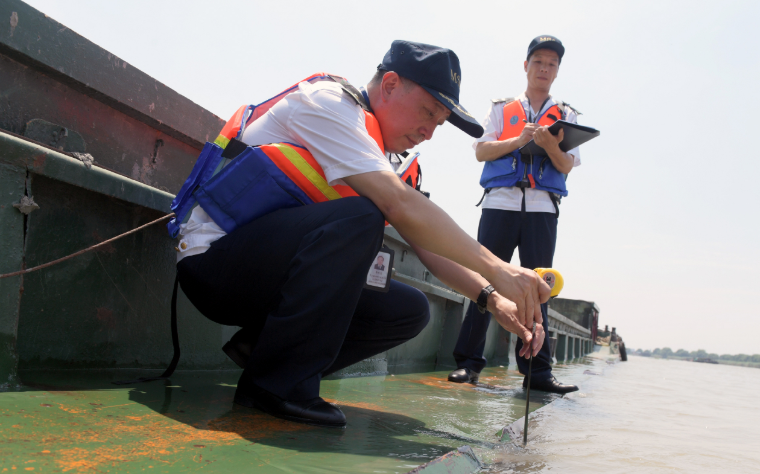 看到交通執(zhí)法人員上船,浙安吉貨0827的船老大連忙解釋,“我知道超了,但前面馬上就到了。”現(xiàn)場(chǎng)測(cè)量顯示,貨船左船舷吃水面的距離為負(fù)2厘米,右船舷吃水面的距離為負(fù)4厘米。證據(jù)擺在眼前,交通執(zhí)法人員現(xiàn)場(chǎng)就開具了執(zhí)法文書,要求船方在規(guī)定時(shí)間內(nèi)到大隊(duì)接受調(diào)查處理。