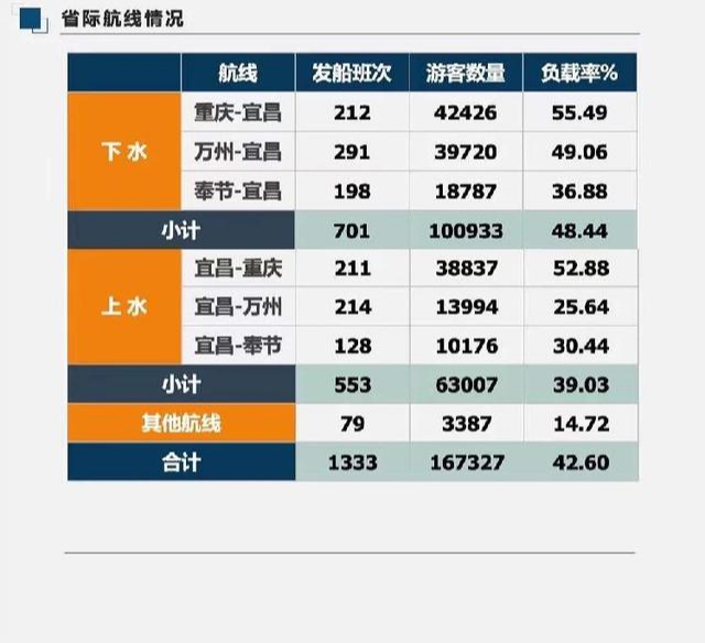 省際客運(yùn)航線中:傳統(tǒng)精品航線(重慶-宜昌、宜昌-重慶)客運(yùn)量占省際客運(yùn)量的48.6%;萬(wàn)州-宜昌、宜昌-萬(wàn)州航線客運(yùn)量占省際客運(yùn)量的32.1%;奉節(jié)-宜昌、宜昌-奉節(jié)航線客運(yùn)量占省際客運(yùn)量的17.3%,其他航線客運(yùn)量占2.0%。