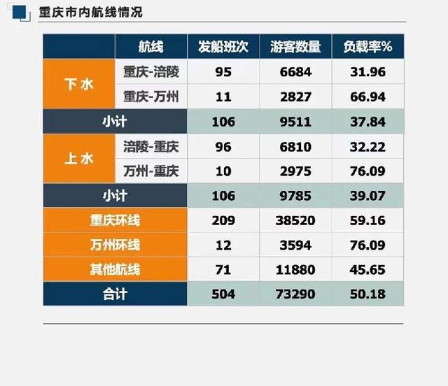 重慶市內(nèi)航線中:重慶-涪陵、涪陵-重慶航線客運(yùn)量占市內(nèi)客運(yùn)量的18.4%;重慶-萬(wàn)州、萬(wàn)州-重慶航線客運(yùn)量占市內(nèi)客運(yùn)量的7.9%;重慶環(huán)線航線客運(yùn)量占市內(nèi)客運(yùn)量的52.6%;萬(wàn)州環(huán)線航線客運(yùn)量占市內(nèi)客運(yùn)量的4.9%;其他航線客運(yùn)量占市內(nèi)客運(yùn)量的16.2%。