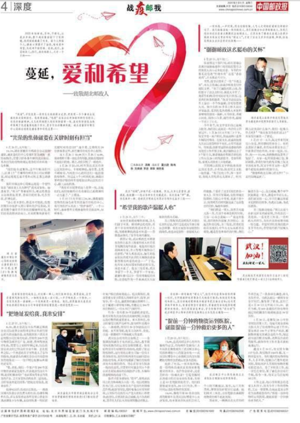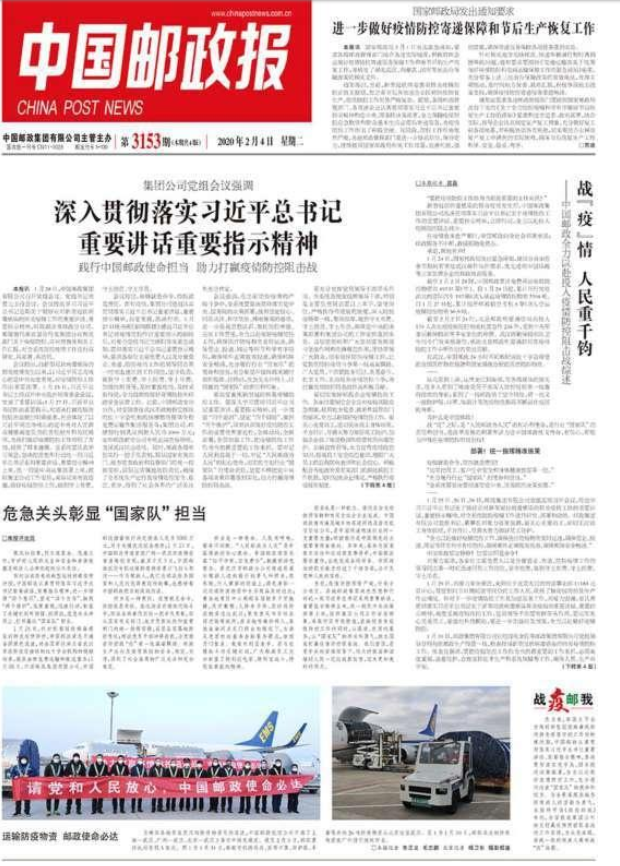 2月4日,《中國(guó)郵政報(bào)》頭版刊發(fā)了中國(guó)郵政集團(tuán)公司黨組要求深入貫徹落實(shí)習(xí)近平總書記重要講話重要指示精神的報(bào)道,并刊發(fā)了綜述文章《戰(zhàn)“疫”情 人民重千鈞》,二三版以“逆行·馳援”為主題報(bào)道了郵政人在疫情防控阻擊戰(zhàn)中的感人故事,四版以“堅(jiān)守”為主題報(bào)道了疫情來臨,郵政人仍在堅(jiān)守崗位,整期報(bào)紙圖文并茂地反映了這個(gè)特殊的春節(jié)期間中國(guó)郵政全力戰(zhàn)“疫”的國(guó)企擔(dān)當(dāng)。