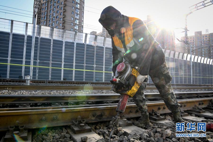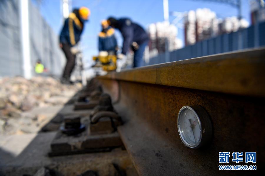 中鐵蘭州局銀川工務段職工進行搗固作業(yè),軌溫計顯示鐵軌溫度為零下10攝氏度