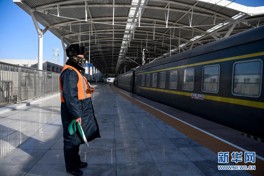 中鐵蘭州局銀川站工作人員手持信號旗在規(guī)定地點接車