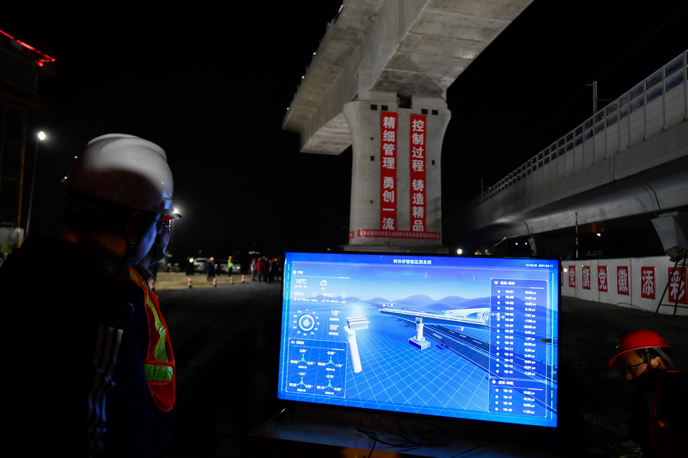 4月21日凌晨,由中鐵四局承建的湖杭鐵路大圩里特大橋上跨杭臨城際鐵路、杭瑞高速、G329國道連續(xù)梁逆時(shí)針轉(zhuǎn)動(dòng)82度,安全跨越既有線,實(shí)現(xiàn)精準(zhǔn)對接到位,這是湖杭鐵路首個(gè)成功轉(zhuǎn)體的連續(xù)梁。