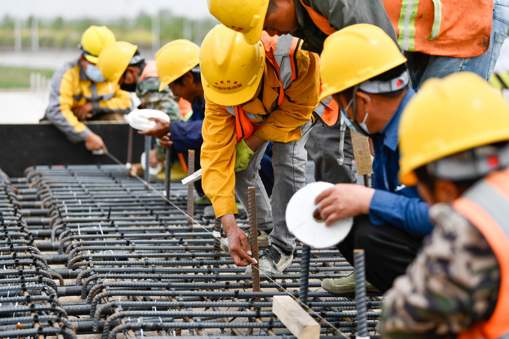 5月23日,中鐵四局工人在河北省唐山市境內京唐鐵路七標段施工現場綁扎鋼筋。