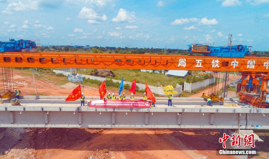 7月5日,隨著架梁作業(yè)人員操作著JQT-180型架橋機(jī)將逢通特大橋最后一片T梁落在橋臺(tái)上,由中鐵五局六公司承建的中老鐵路最長(zhǎng)橋梁——逢通特大橋架設(shè)完成,這標(biāo)志著“一帶一路”標(biāo)志性工程中老鐵路正線架梁貫通。逢通特大橋位于老撾首都萬(wàn)象市,橋長(zhǎng)7528.56米,共計(jì)227跨橋梁,橋梁運(yùn)輸、架設(shè)安全管理難度大,是本標(biāo)段的控制工程。 中新社發(fā) 謝永彬 攝