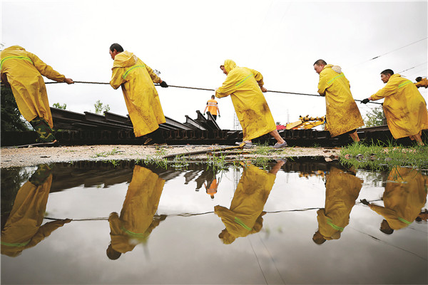 中國鐵路鄭州局集團有限公司日前對焦柳鐵路無縫線路進行49.5公里的長軌更換。施工完成后,南陽工務(wù)段組織人員對管內(nèi)區(qū)段線路更換下來的4000多條舊鋼軌進行全面回收。這些更換下來的舊鋼軌將通過各種方式冶煉“變身”,變廢為寶,物盡其用。圖①、圖②為7月20日,南陽工務(wù)段組織人員冒雨回收舊鋼軌。張中海 攝
