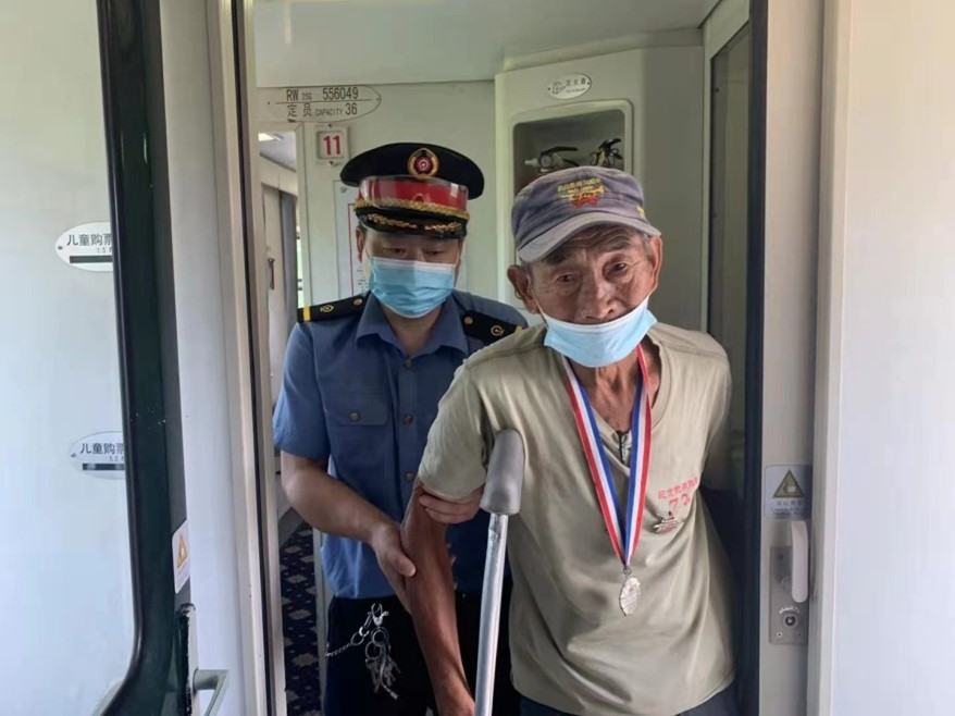 2021年7月30日,由杭州始發(fā)開往大同的K892次列車準(zhǔn)時(shí)發(fā)車,在亳州站上了一位90多歲的老人,列車員立即熱情地把他攙扶到座位上。