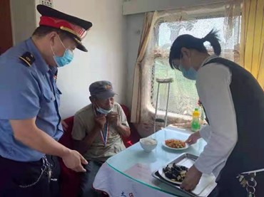 列車長了解此情況后,立即把老人請到餐車重點(diǎn)照顧,還攙扶老人去廁所,中午為老人免費(fèi)送上可口的飯菜,還在老人下車時(shí)與石家莊北站的值班員進(jìn)行了愛心交接。