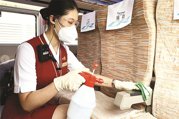 圖②為8月6日,G8811次列車乘務(wù)員對座椅扶手進(jìn)行消毒。梁嘉文 攝