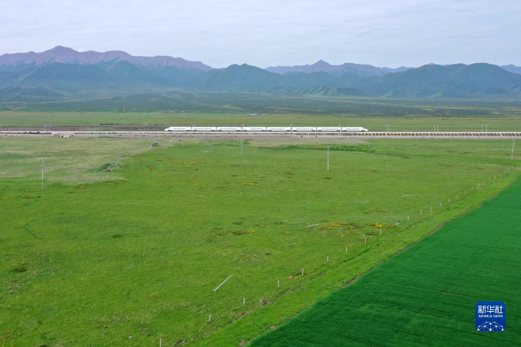 動(dòng)車(chē)組列車(chē)從祁連山下山丹馬場(chǎng)穿行而過(guò)(7月15日攝,無(wú)人機(jī)照片)。新華社記者 范培珅 攝