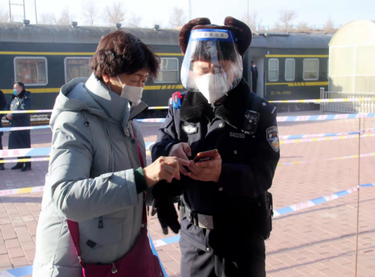 圖為:2022年2月19日,錫林浩特鐵路公安處查布嘎車站派出所民警幫助出站旅客進(jìn)行防疫“場(chǎng)所碼”掃碼登記。