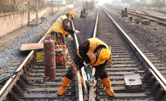 (職工對電焊后的道岔進行打磨作業(yè))