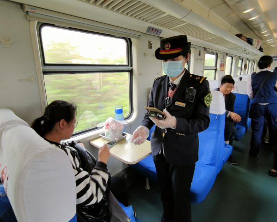 (列車(chē)長(zhǎng)黃彥娟在查驗(yàn)旅客車(chē)票時(shí)的情景)