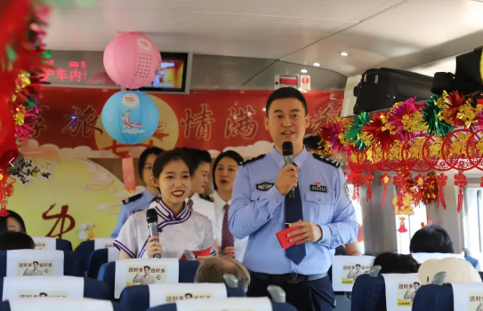 歡快的“快閃”開場舞拉開了歡慶活動(dòng)的序幕。節(jié)目精彩紛呈,《烏蘭巴托的夜》歌聲悠揚(yáng)高亢,《水調(diào)歌頭》的舞蹈曼妙迷人。沈陽乘警支隊(duì)工作人員通過寓教于樂的方式,向大家宣傳反詐常識(shí)和列車安全提示,還與旅客進(jìn)行反詐知識(shí)互動(dòng)問答,答對(duì)的旅客可獲得警察小熊玩偶,為旅客乘車安全保駕護(hù)航;(dòng)環(huán)節(jié)中,乘務(wù)人員與旅客一同猜燈謎、有獎(jiǎng)競猜,贈(zèng)送桂花香囊和小掛件給旅客,列車上充滿歡聲笑語。最后,大家齊唱《歌唱祖國》并合影留念,將活動(dòng)推向高潮。