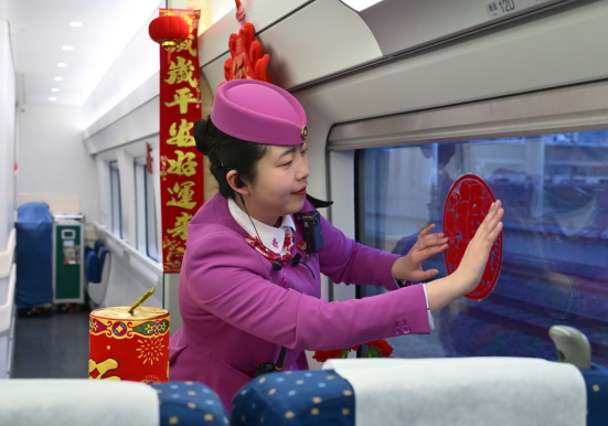 步入車廂,濃郁的年味便撲面而來。紅燈籠、中國結(jié)錯落懸掛,福字剪紙貼滿車窗,將車廂裝點(diǎn)成了移動的“新春小屋”。車廂連接處,“春運(yùn)心愿墻”被紅金兩色的便簽紙裝點(diǎn)得格外喜慶,一旁的“春運(yùn)一起回家”主題展板,將高鐵的“快”與旅客的“盼”巧妙融合。