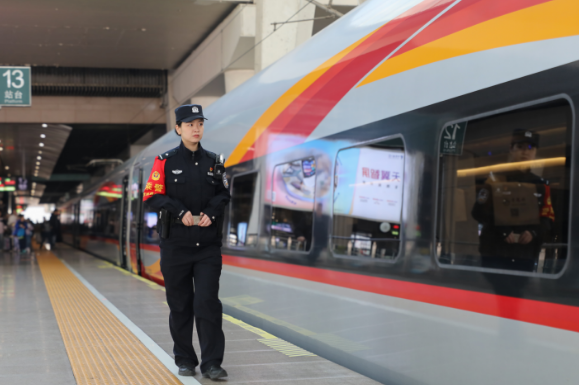 霍宇瑩,北京鐵路公安處女子乘警隊民警。她值乘的G597次列車單程穿越近1400公里公里,往返北京與上海之間,途經(jīng)5省10站,每一段線路、每一個區(qū)間,都深深刻在她的心里。