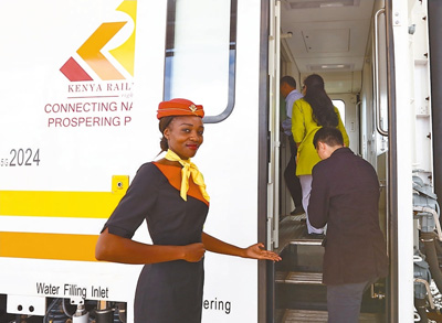 圖為4月27日,在肯尼亞蒙內(nèi)鐵路阿西里弗站,一名乘務(wù)員歡迎參加試乘的乘客登車。(記者 潘思危攝)