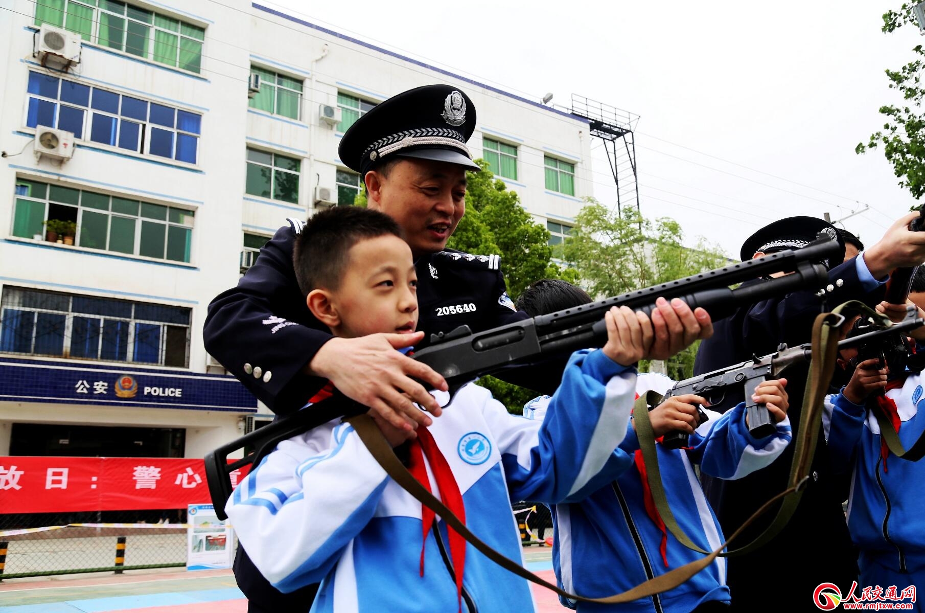 2、民警現(xiàn)場(chǎng)邀請(qǐng)小朋友進(jìn)行槍械體驗(yàn)。