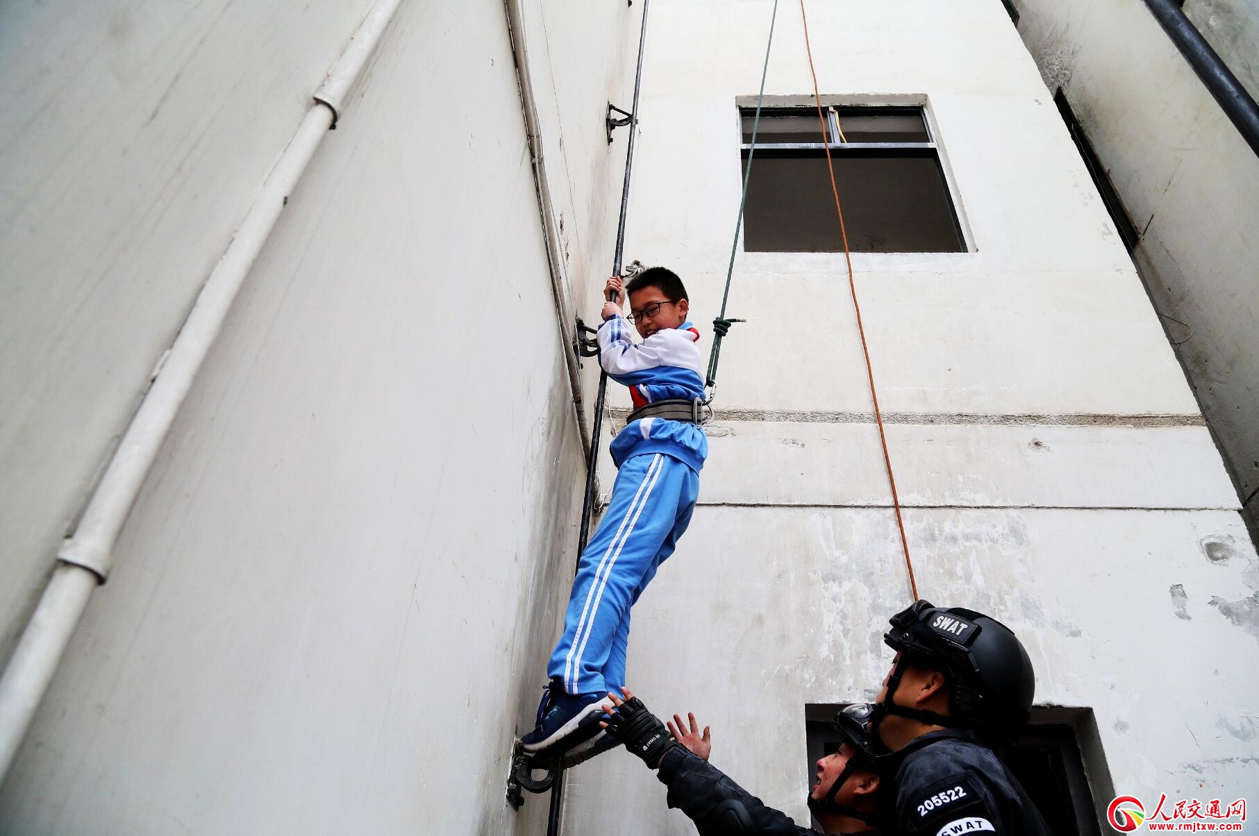 5、民警邀請(qǐng)參加活動(dòng)小學(xué)生體驗(yàn)高樓索降。