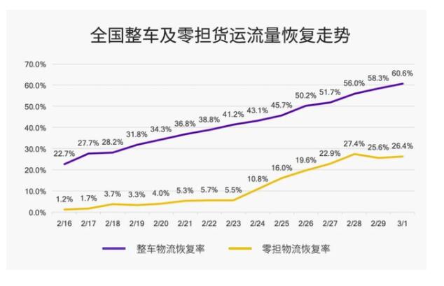 來源:易流科技(樣本規(guī)模:150萬輛貨運(yùn)車輛的的運(yùn)行數(shù)據(jù))據(jù)G7物聯(lián)網(wǎng)平臺、車滿滿以及廣安車聯(lián)的統(tǒng)計(jì)數(shù)據(jù)顯示,自2月16日以來,全國長途整車運(yùn)輸流量恢復(fù)呈現(xiàn)穩(wěn)步上升態(tài)勢,3月1日恢復(fù)率為去年旺季11月份(以下簡稱“去年”)60.6%,較前一日增長2.3%;全國零擔(dān)物流流量自2月24日以來出現(xiàn)明顯上升,3月1日的恢復(fù)率為去年26.4%。