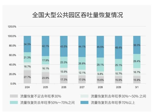 截至3月1日,全國347個(gè)大型公共園區(qū)吞吐流量達(dá)到去年30%以上的有292個(gè),占比84%;吞吐量達(dá)到50%以上的有234個(gè),占比67%;吞吐量達(dá)到70%以上的有132個(gè),占比38%。