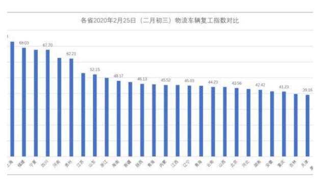 據(jù)易流科技數(shù)據(jù),對比2月25日的各省物流車輛復(fù)工指數(shù)發(fā)現(xiàn),截至2月25日(農(nóng)歷二月初三)物流車輛復(fù)工水平最高的省份是廣東省,達(dá)74.08;最低的省份是湖北省,為17.09。香港、澳門、臺灣以及西藏由于樣本數(shù)據(jù)不足等原因,沒有納入對比中。