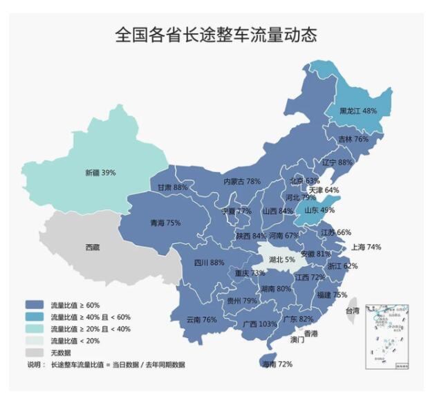 據(jù)G7平臺數(shù)據(jù)顯示,主要省份整車流量動(dòng)態(tài)中,廣西、遼寧、四川、甘肅、陜西、廣東、安徽、山西、湖南9省市長途整車流量達(dá)到去年同期80%;河北、貴州、內(nèi)蒙、寧夏、云南、吉林、青海、福建、上海、重慶、海南、江西12省市長途整車流量達(dá)到去年同期70%;北京、河南、江蘇、天津、浙江5省市長途整車流量達(dá)到去年同期60%;山西、黑龍江、新疆整車流量分別為去年同期49%、48%、39%;湖北省仍為5%。