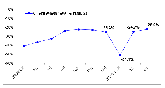 4月,CTSI貨運(yùn)指數(shù)比兩年前同期(即2019年4月)增長(zhǎng)14.5%,兩年增長(zhǎng)幅度連續(xù)6個(gè)月保持在15%左右增長(zhǎng)區(qū)間。周健指出,從貨運(yùn)與經(jīng)濟(jì)發(fā)展之間的長(zhǎng)期關(guān)系看,表明我國(guó)經(jīng)濟(jì)有望保持良好發(fā)展態(tài)勢(shì);CTSI客運(yùn)指數(shù)比兩年前同期下降22.0%,兩年降幅較3月收窄2.7個(gè)百分點(diǎn),呈現(xiàn)持續(xù)恢復(fù)態(tài)勢(shì)。