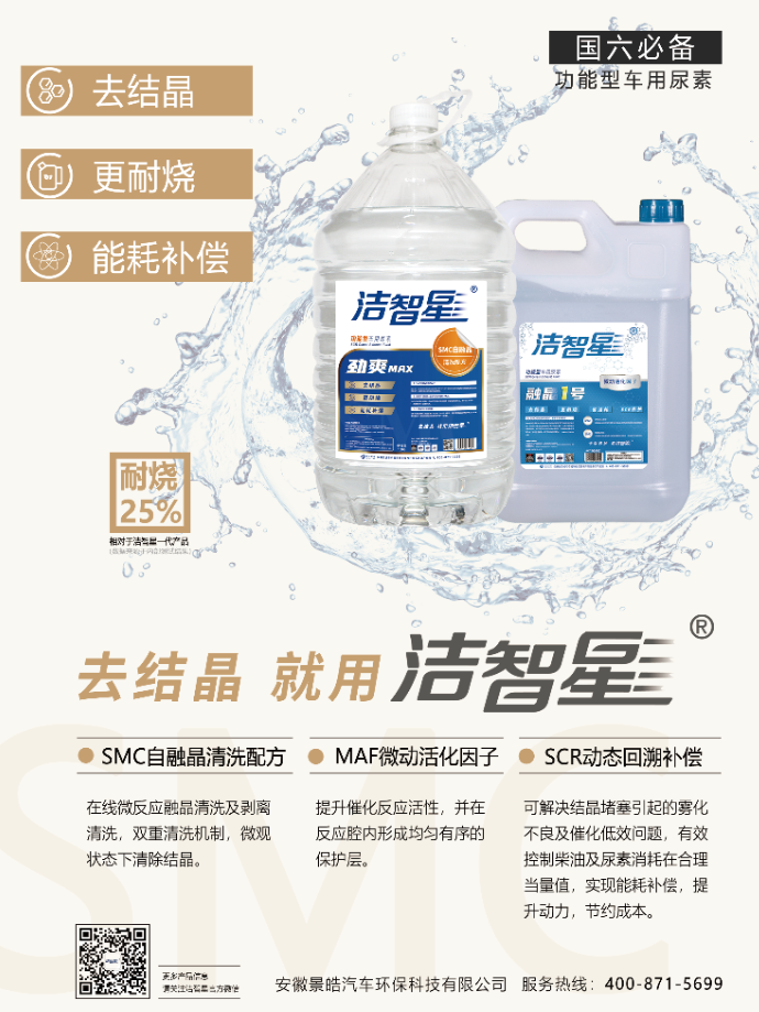 潔智星的新一代車用尿素溶液打破了原有的技術(shù)路線,研發(fā)出 SMC(Self Melting Crystal CleaningTechnology)一自融晶清洗技術(shù),實(shí)現(xiàn)微觀狀態(tài)下清除結(jié)晶的功能,并能讓SCR系統(tǒng)持續(xù)保持清潔,讓尿素結(jié)晶這個弊端成為歷史,在符合GB29518-2013標(biāo)準(zhǔn)的條件下從“常規(guī)型”尿素溶液升級成第二代功能型”車用尿素溶液。
