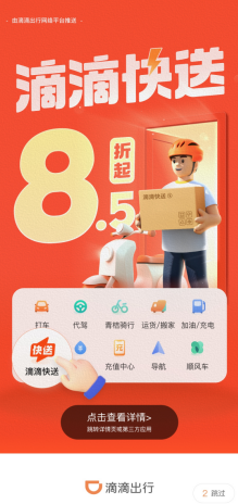 6月13日,滴滴出行平臺(tái)新增滴滴快送業(yè)務(wù),目前已接入達(dá)達(dá)快送、閃送、UU跑腿三家公司,提供“經(jīng)濟(jì)幫送”、“專人直送”的小規(guī)格物品的即時(shí)配送服務(wù)。目前已在成都、杭州、北京等全國(guó)200多個(gè)城市開(kāi)通服務(wù)。