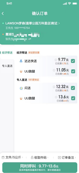 滴滴用戶可以在平臺(tái)上一鍵呼叫多家快送服務(wù)商,根據(jù)各服務(wù)商的實(shí)時(shí)價(jià)格以及自身的時(shí)效需求作出選擇;也可以同時(shí)選擇多家服務(wù)商下單,滴滴快送將根據(jù)各服務(wù)商的接單速度為用戶完成最快速的服務(wù)匹配。