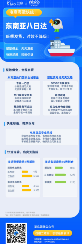“我們希望通過數(shù)字化的全鏈路海運產(chǎn)品,幫助跨境商家把握東南亞的電商發(fā)展機遇。”菜鳥國際供應鏈海運負責人表示,中遠海運快速、穩(wěn)定的班期加上菜鳥數(shù)字物流科技,極大提升海運電商物流的履約穩(wěn)定性,從而確保海外雙11大促的收貨履約時效。