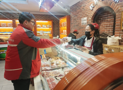 在哈爾濱紅腸專賣店,京東小哥幫客戶打包紅腸
