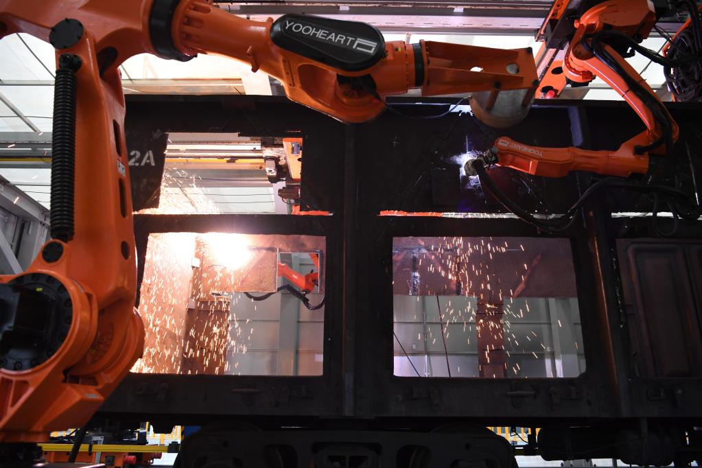 在現(xiàn)場看到,一節(jié)黑色貨車車廂進(jìn)入自動化報廢貨車拆解生產(chǎn)線后,多臺機(jī)器人手臂協(xié)同操作,對貨車車廂進(jìn)行切割,生產(chǎn)線上頓時火光四濺,幾十分鐘后,貨車車廂就被切割拆解完畢。
