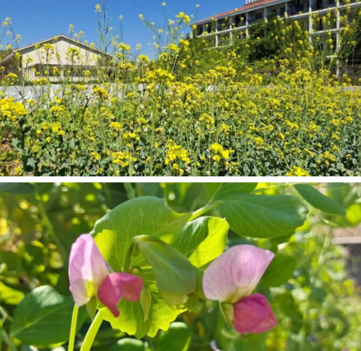 早晨的職工菜園里,流著水茵茵的綠色。嬌艷的豌豆花還帶著清晨的露珠,微風(fēng)吹過,油菜花輕輕搖曳,讓人心生“偷得浮生半日閑”之感。勤勞的蜜蜂已開始一天的勞作,流連在這滿園的春色里。