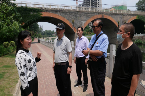 (信陽市平橋區(qū)明港鎮(zhèn)委宣傳委員余秋菊(左一)在明河大橋下向信陽市文化歷史考察員介紹明河大橋的歷史)
