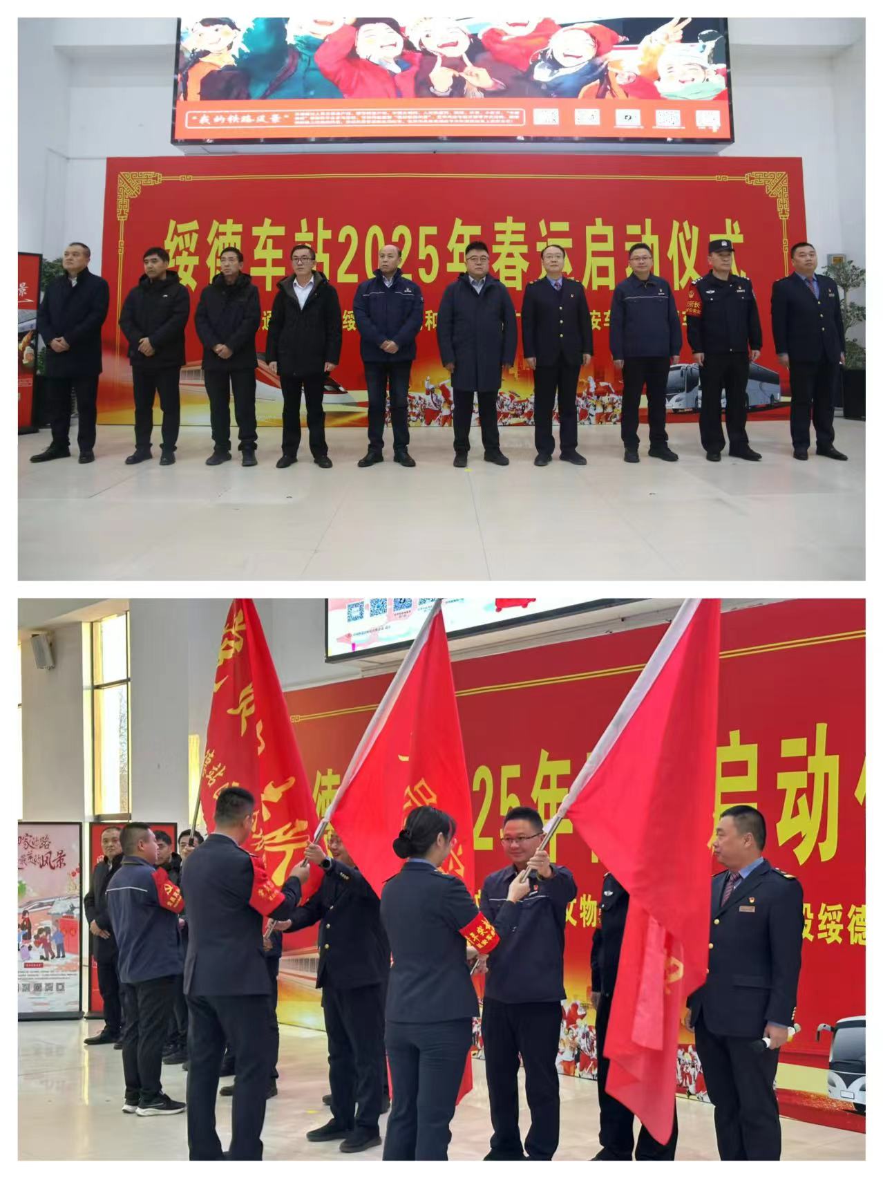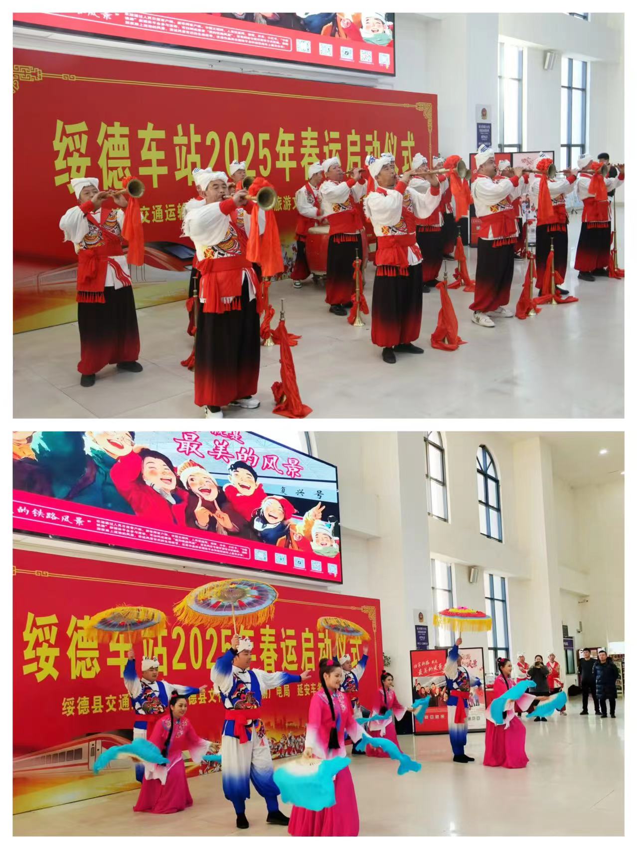 2025年1月14日,陜西榆林綏德車站要請了綏德縣交通運輸局、文化和旅游廣電局、綏德供電段、綏德車站派出所在候車室舉行了春運啟動儀儀式。綏德縣副縣長賀鵬飛同志、延安車務段、綏德供電段黨委書以及其他單位領導參加了啟動儀式。