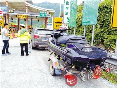 4月30日下午,重慶市高速公路執(zhí)法三支隊四大隊執(zhí)法人員巡邏至渝湘高速出城方向板溪收費站,發(fā)現(xiàn)一輛越野車停在收費站上道口,車后拖著一輛摩托艇,兩名男子正與收費員發(fā)生爭執(zhí)。
