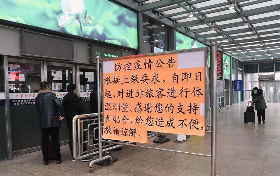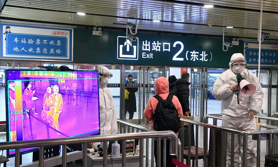 1月28日,在北京西站出站口,工作人員通過紅外測溫儀對進(jìn)站旅客的體溫進(jìn)行檢測。