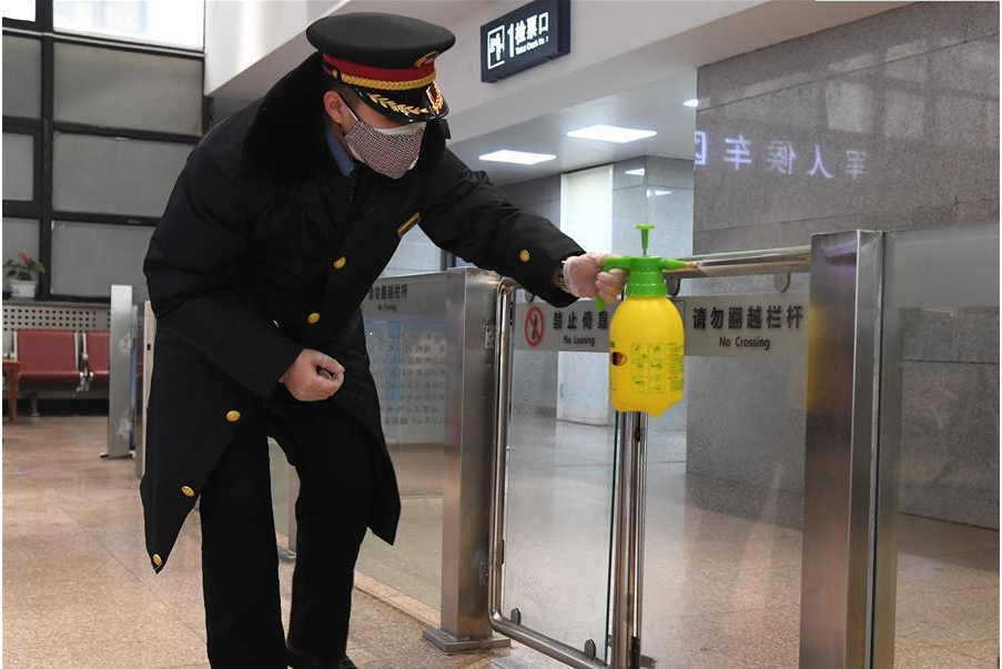 1月28日,工作人員對候車室進(jìn)行消毒。