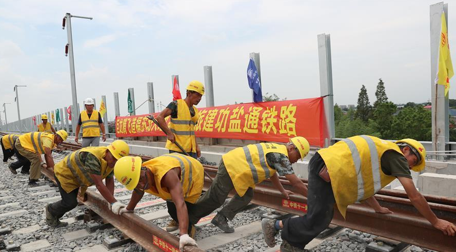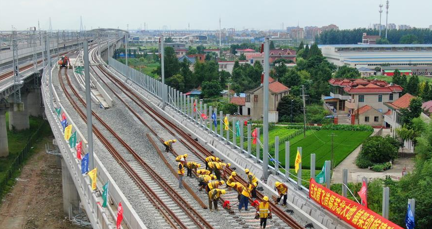 8月7日,工人在鹽通高鐵最后一組無(wú)縫鋼軌鋪設(shè)現(xiàn)場(chǎng)忙碌。 當(dāng)日,由中鐵十一局三公司施工的鹽通高鐵全線軌道正式鋪通。
