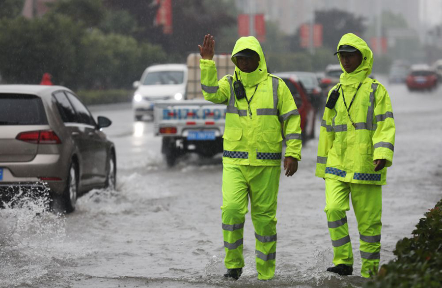 7月20日,河南省武陟縣公安局交警大隊民警在積水路段指揮車輛通行。新華社發(fā)(馮小敏 攝)