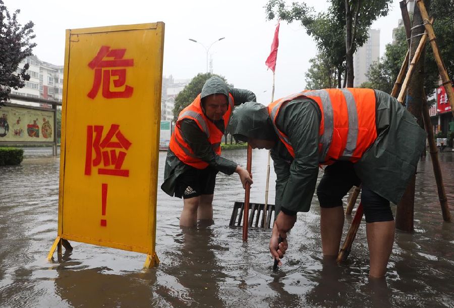 7月20日,河南省武陟縣城市管理局工作人員在疏通排水管道。新華社發(fā)(馮小敏 攝)