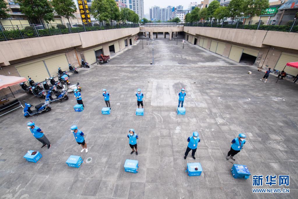 8月9日,在張家界餓了么運(yùn)營中心,外賣員出發(fā)前集合開晨會。