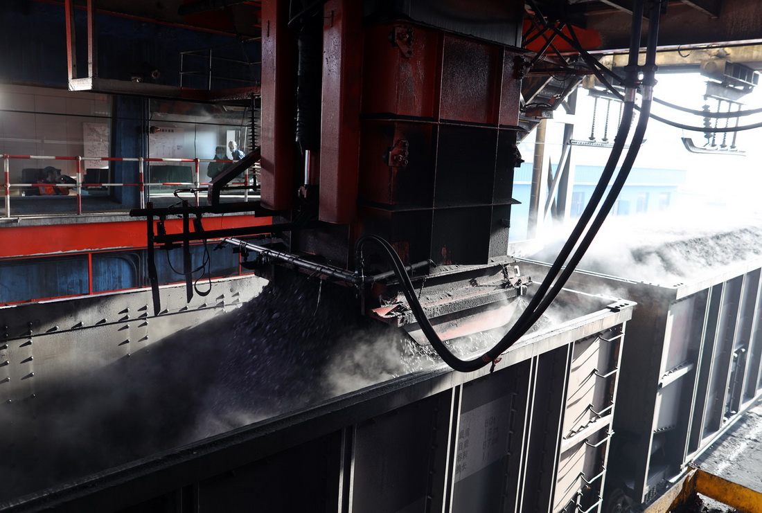 11月16日,國(guó)家能源神東煤炭集團(tuán)大柳塔煤礦的機(jī)械設(shè)備在往運(yùn)煤列車裝煤。新華社記者 賈立君 攝