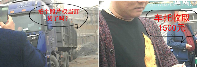 在爆料者提供的監(jiān)控視頻截圖中,本刊記者發(fā)現(xiàn)了上位這位司機(jī)所言及的有關(guān)不卸車也需要繳納費(fèi)用,及另一位幫助被扣司機(jī)處理相關(guān)事宜的“社會人員”照片,視頻顯示日期為3月8日?梢,萊蕪市交通運(yùn)輸局按照這種方式處理超限超載已經(jīng)成為常態(tài)。