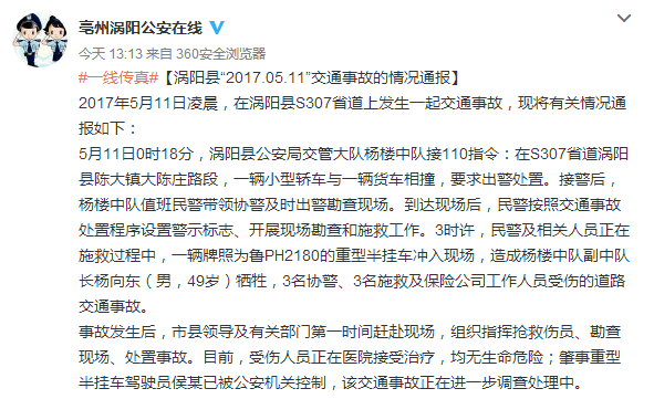 目前,受傷人員正在醫(yī)院接受治療,均無生命危險(xiǎn);肇事重型半掛車駕駛員侯某已被公安機(jī)關(guān)控制,該交通事故正在進(jìn)一步調(diào)查處理中。